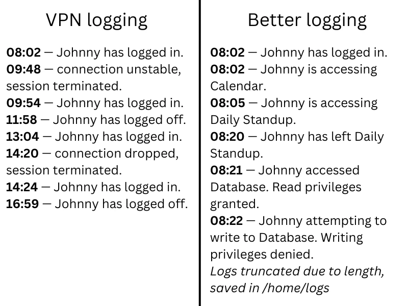 When it comes to logging and auditing, VPNs leave a lot to be desired. Because they work on layer 4 of the OSI layer, VPNs are not able to provide the detailed logs and audit trails required to monitor user activity and protect against data breaches.