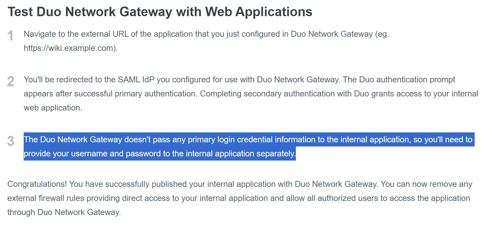Companies looking for an SSO-solution will not be satisfied by DNG. Duo’s DNG proxy cannot pass user credentials to protected applications, resulting in multiple sign-in processes: